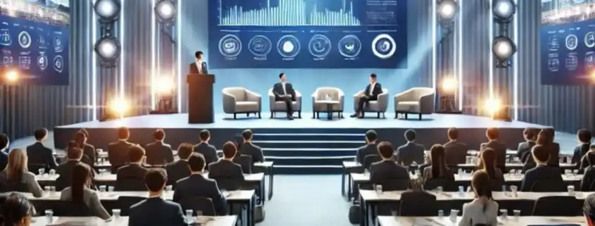 • Stage Lighting: Spotlights and uplights highlight presenters.